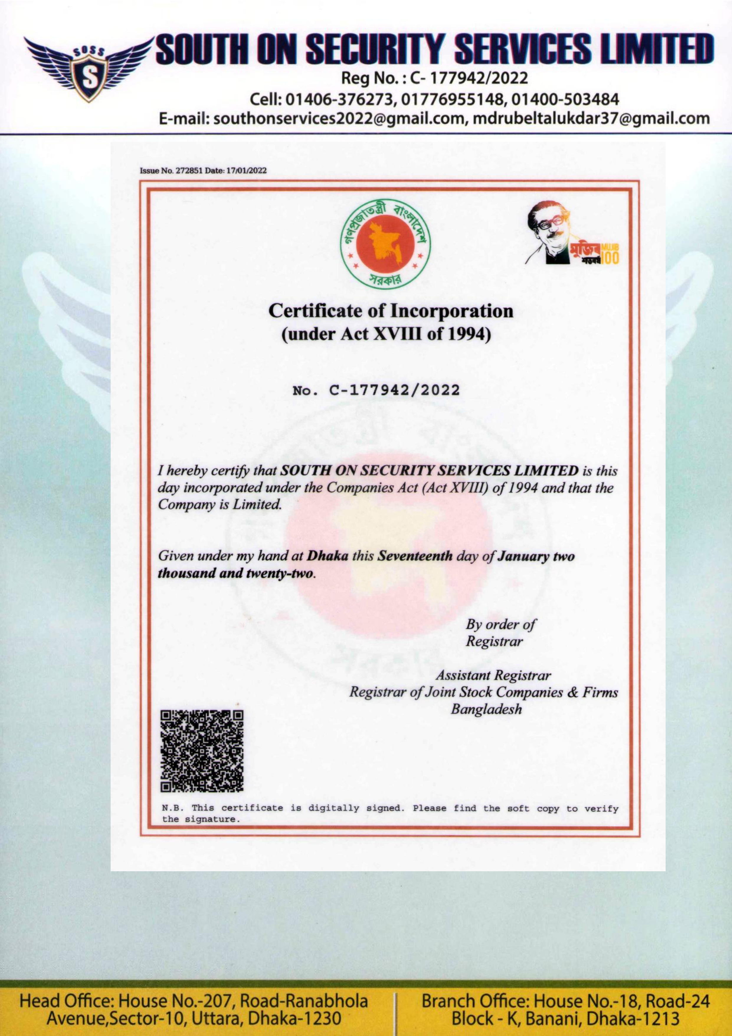 South On Security Services Limited is fully licensed and incorporated under the Companies Act of Bangladesh. Our Certificate of Incorporation from RJSC confirms our legal authority to deliver professional security services nationwide.