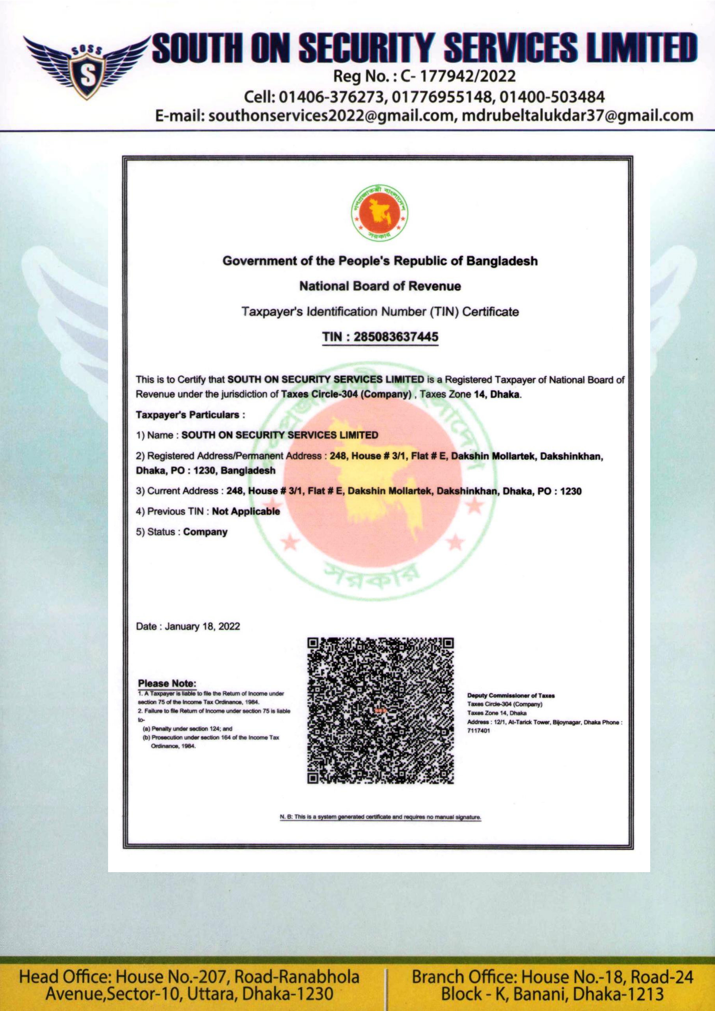 We are a legally registered company under the Registrar of Joint Stock Companies & Firms (RJSC), Bangladesh. South On Security Services Limited received its Certificate of Incorporation in January 2022, confirming our official approval to operate as a Limited Company. This certificate ensures that our services are recognized and authorized by the government.Our Certificate of Incorporation, issued by the Registrar of Joint Stock Companies & Firms (RJSC), validates South On Security Services Limited as a legally recognized and government-approved security service provider. This document represents our authenticity, reliability, and commitment to providing professional and compliant security solutions across Bangladesh